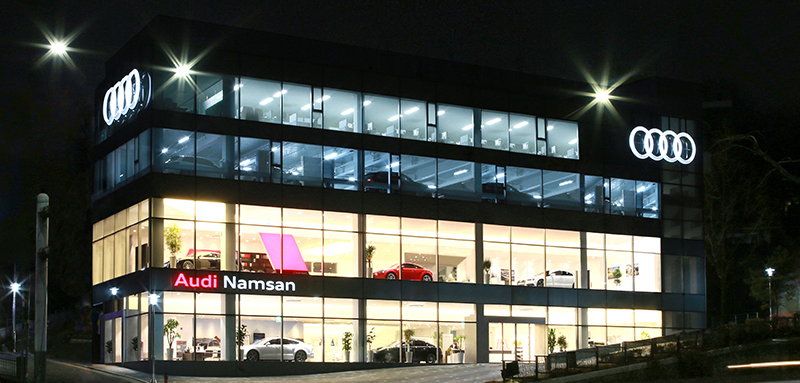 기존 이태원동에 위치했던 ‘아우디 용산 전시장 및 서비스센터’를 중구 동호로에 위치한 신축 건물로 이전하여 연면적 2,744㎡의 지하 2층, 지상 4층 규모의 ‘아우디 남산 전시장 및 서비스센터’로 새롭게 문을 열었으며, 3S(Showroom, Service, Spare parts) 컨셉으로 신차 구매에서부터 차량 정비까지 한 곳에서 서비스 받을 수 있어 고객들의 편의를 극대화 한 것이 특징이다.