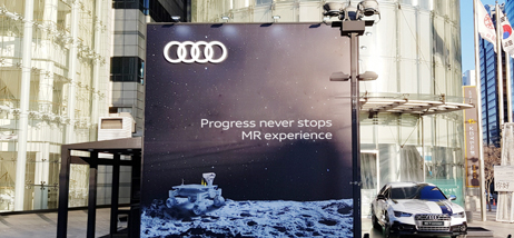 ‘아우디 MR 익스피리언스 (Audi MR Experience)’는 아우디 브랜드 캠페인인 ‘Progress never stops’의 일환으로, 관객들은 부스에 설치된 위, 아래, 좌, 우, 바닥까지 총 5개의 스크린을 통해 총 3개의 혼합현실 (Mixed Reality, 증강현실 AR과 가상현실 VR을 결합한 기술) 공간을 직접 체험하게 된다.